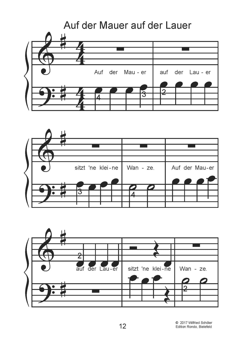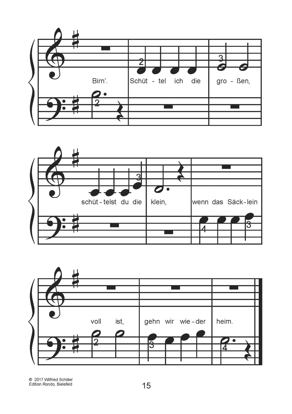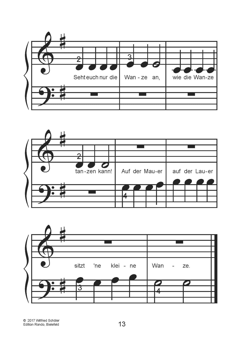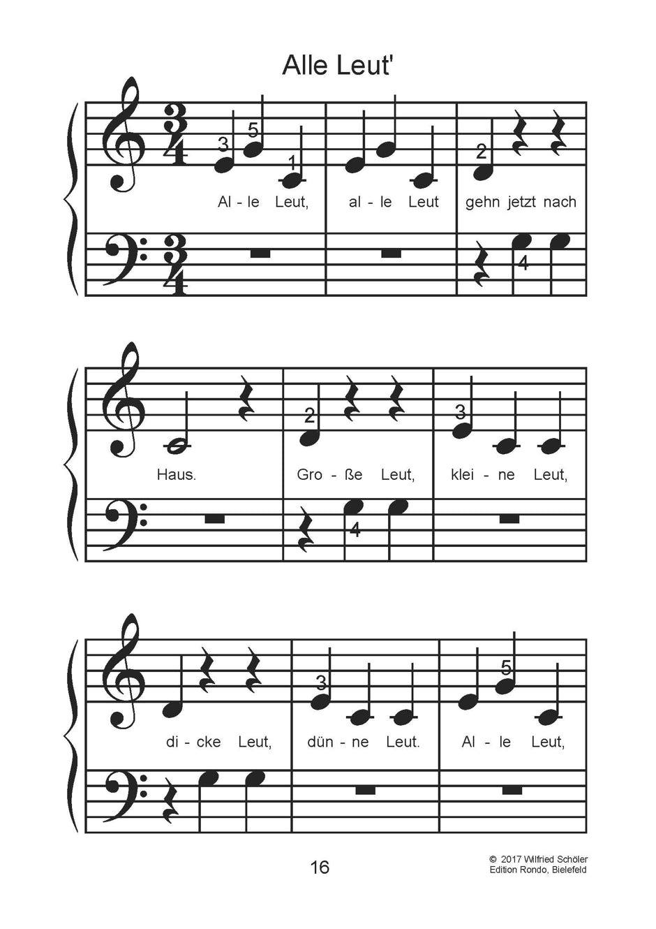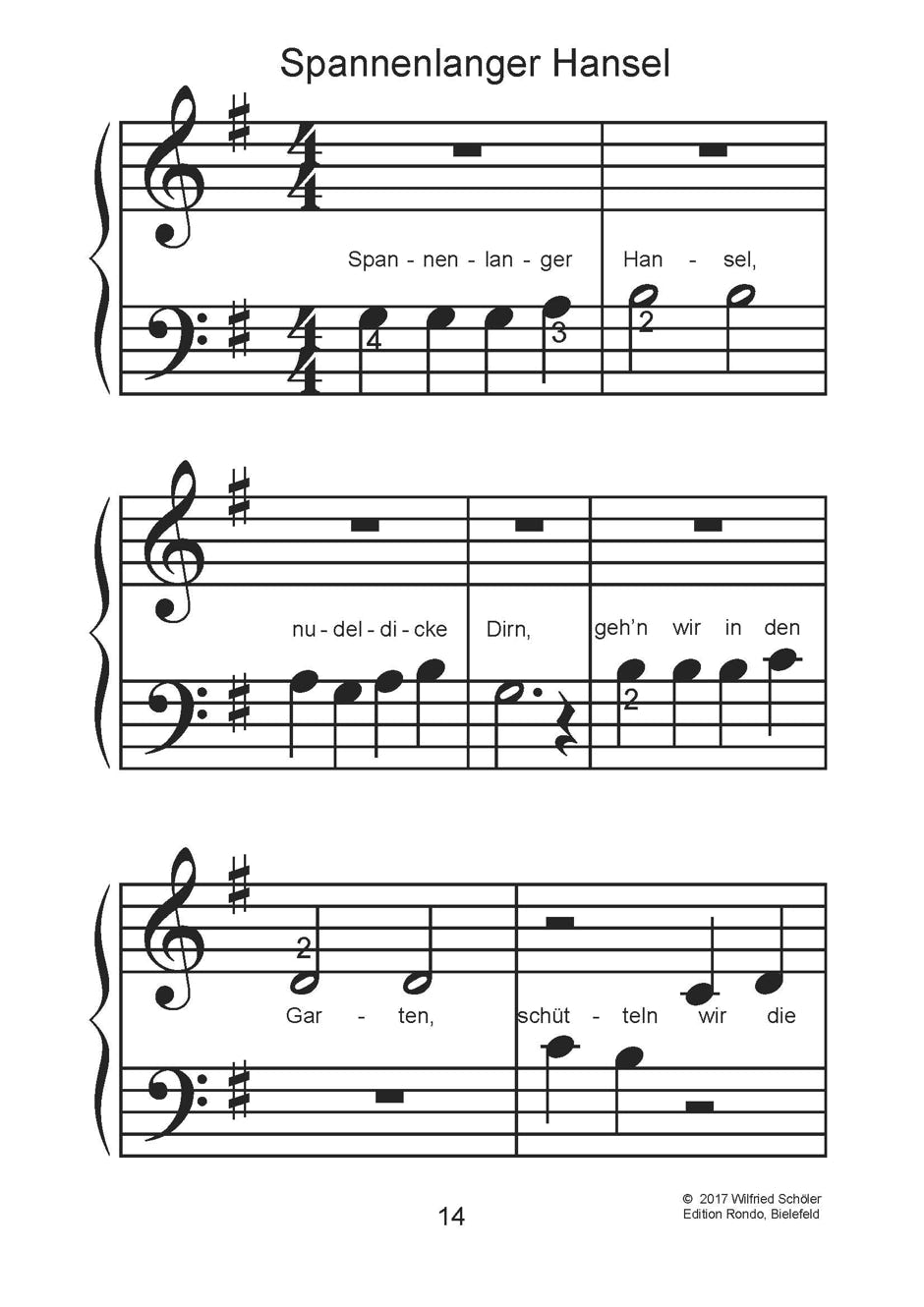 ABC - Alle Leut - Alle meine Entchen - Auf der Mauer - Auf unsrer Wiese - Backe Backe Kuchen - Der Kuckuck und der Esel - Dornröschen - Drei Chinesen - Durch die Straßen - Es tanzt ein Bi-Ba-Butzemann - Es war eine Mutter - Fuchs, du hast die Gans gestohlen - Grün grün grün - Hänschen klein - Hänsel und Gretel - Hopp hopp hopp - Ich lieb den Frühling - Kuckuck kuckuck - Mein Hut der hat drei Ecken - Old McDonald - Spannenlanger Hansel - Summ summ summ - Suse liebe Suse - Wenn ich ein Vöglein wär - Winter ade