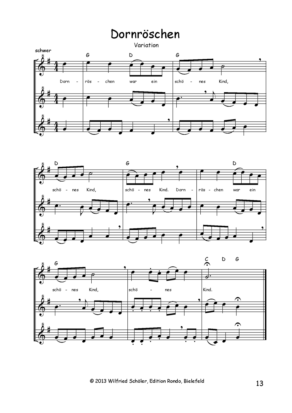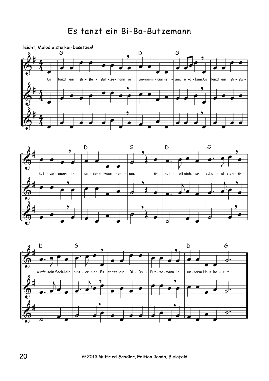 Alle Liedersätze sind jeweils für 3 Sopranflöten (Querflöten). Sie sind so eingerichtet, dass immer schon die erste und zweite Stimme einen wohlklingenden Satz ergeben. Die dritte Stimme ist eine klangliche Erweiterung, kann aber weggelassen werden, ohne dass der Satz unvollständig klingt.