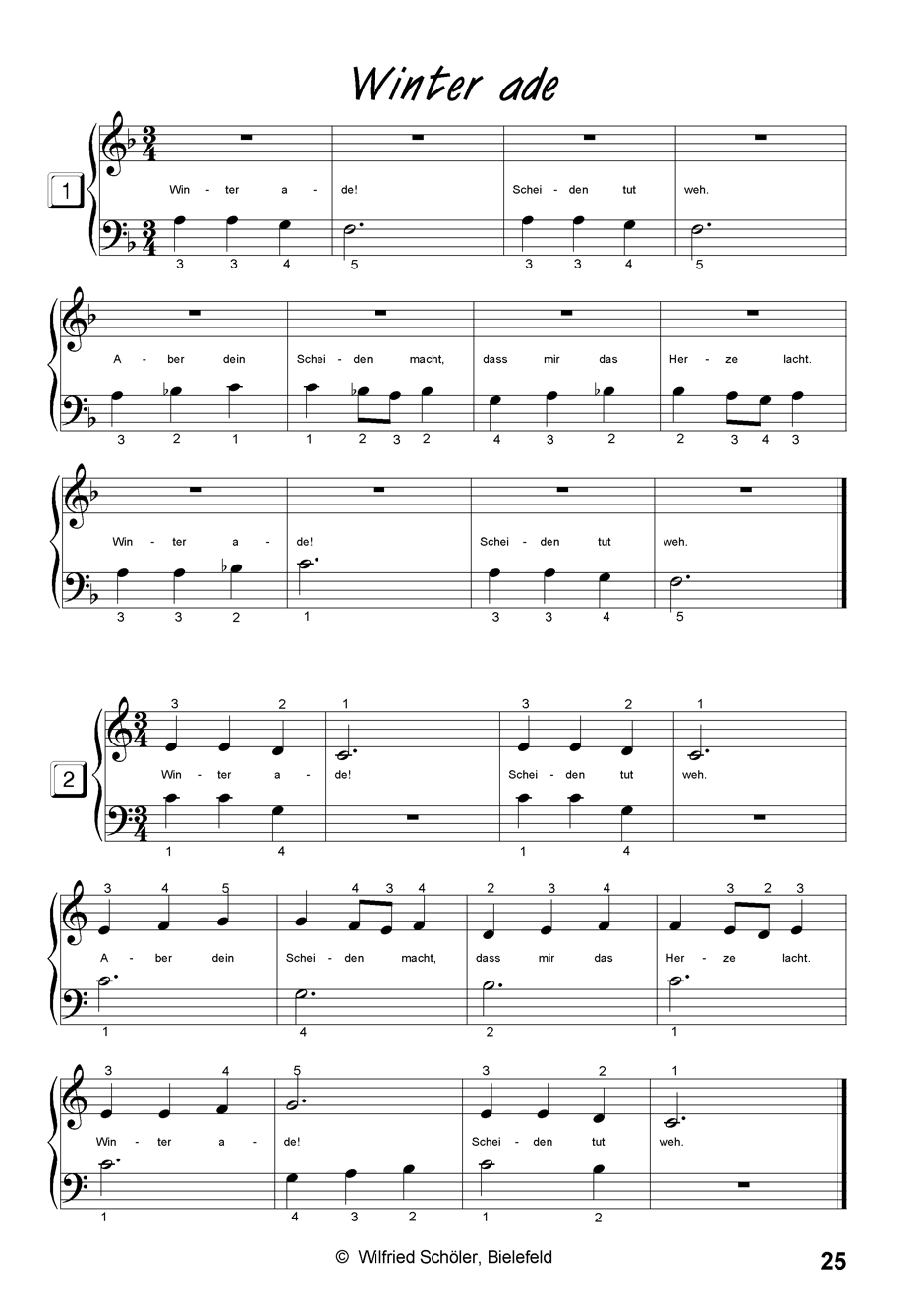 Es gibt einen Anhang, der aus sieben Stücken zum Auswendiglernen besteht, die ich bis auf das erste und letzte selbst geschrieben habe. Ihnen liegt ein sich wiederholendes Fingersatz-Schema zugrunde, und die Erfahrung zeigt, dass Kinder gerade diese Stücke mit Begeisterung spielen. Sie klingen anspruchsvoll, sind aber technisch einfach.