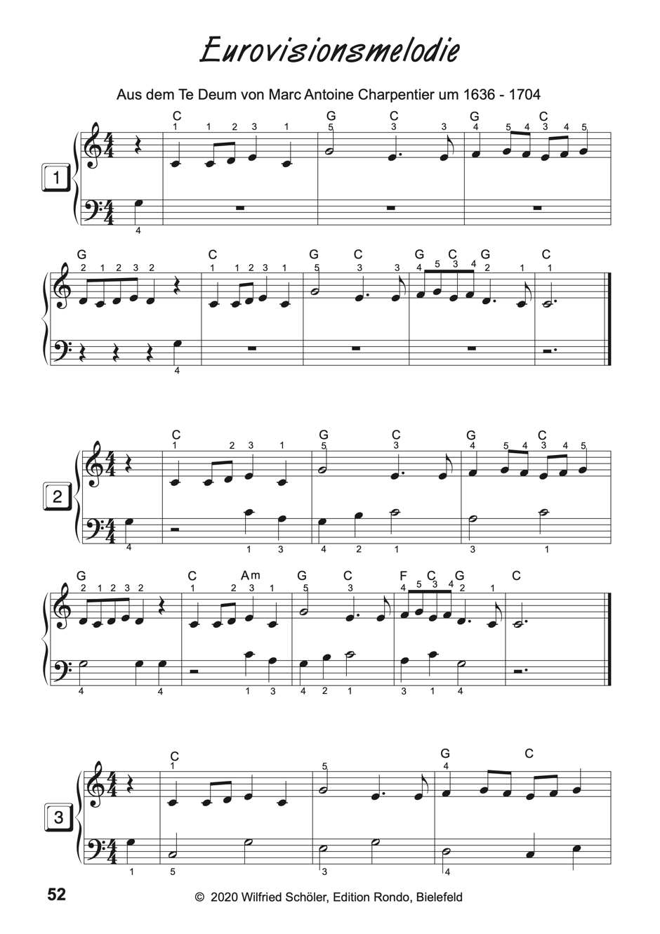 An die Freude - Auf der Mauer - Bruder Jakob - Can Can - Der Kuckuck und der Esel - Die Vogelhochzeit - Drei Chinesen mit dem Kontrabass - Eurovisionsmelodie - Fuchs, du hast die Gans gestohlen - Für Elise - Hänschen klein - Hänsel und Gretel - Happy Birthday - O when the Saints - Morgenstimmung (von E. Grieg) - Old McDonald - Summ summ summ - The Entertainer - Winter ade -