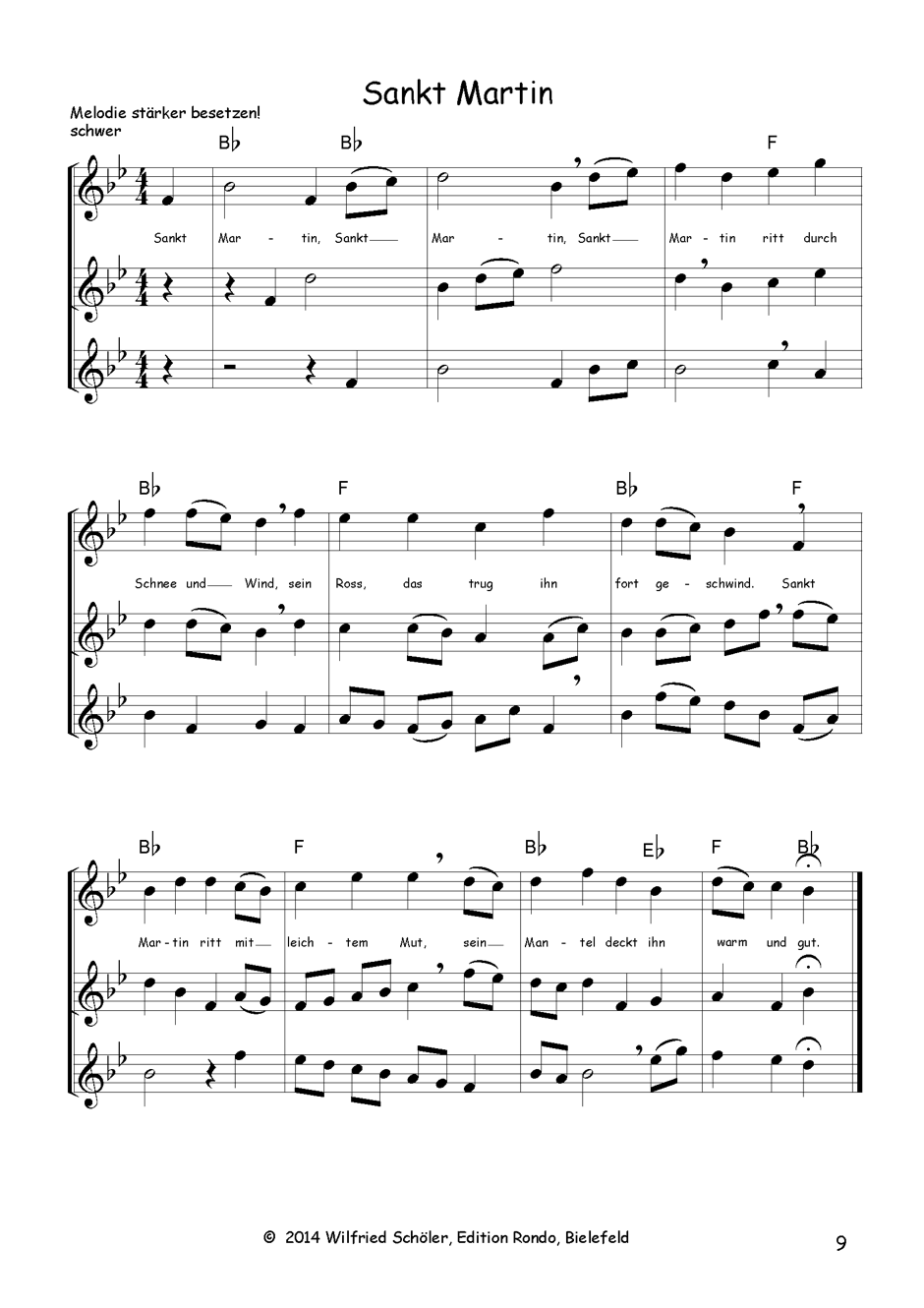 Die Liedsätze sind dreistimmig. Die ersten beiden Stimmen ergeben schon einen vollständigen Satz. Die 3. Stimme ist eine klangliche Erweiterung, kann aber bei Mangel an Mitspielern auch weggelassen werden.