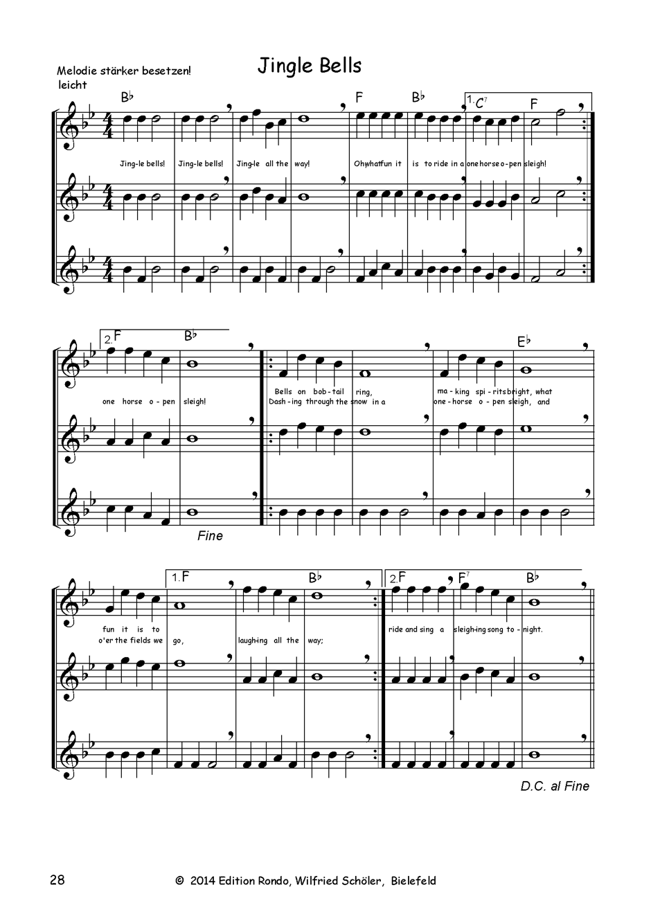 Die Lieder haben jeweils zwei Bearbeitungen, einmal leicht, einmal schwer. Man kann sie deshalb sehr flexibel einsetzen. Alle Lieder sind auch mit Akkordbezeichnungen für Gitarre, Keyboard oder Akkordeon versehen. Deshalb kann man das Buch auch sehr gut für die weihnachtliche Hausmusik verwenden.