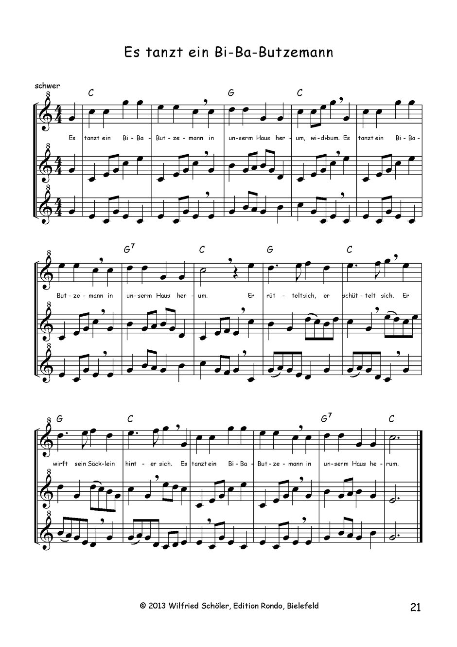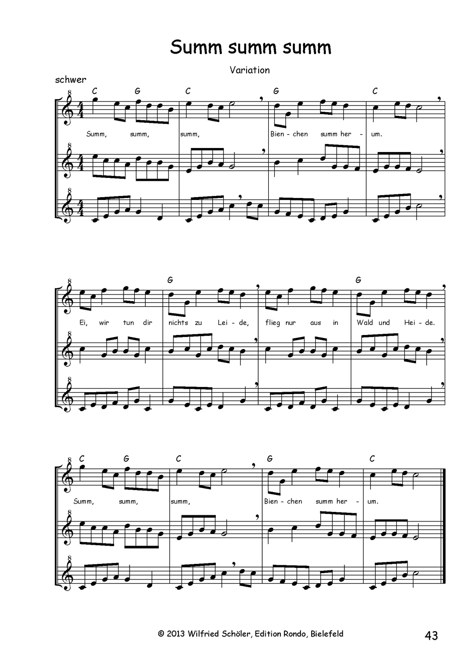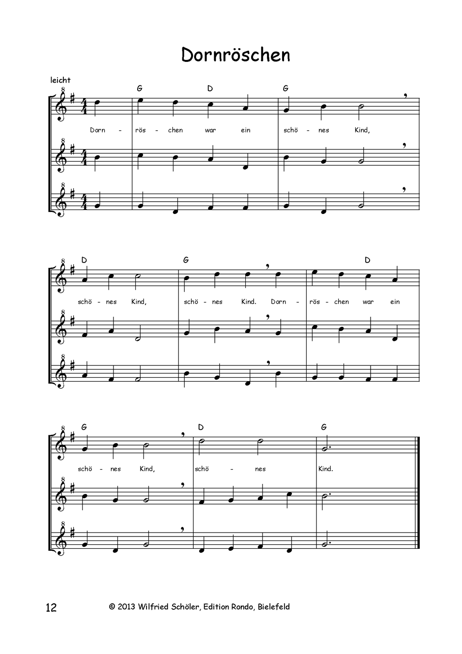 Alle Liedersätze sind jeweils für 3 Sopranflöten (Querflöten). Sie sind so eingerichtet, dass immer schon die erste und zweite Stimme einen wohlklingenden Satz ergeben. Die dritte Stimme ist eine klangliche Erweiterung, kann aber weggelassen werden, ohne dass der Satz unvollständig klingt.