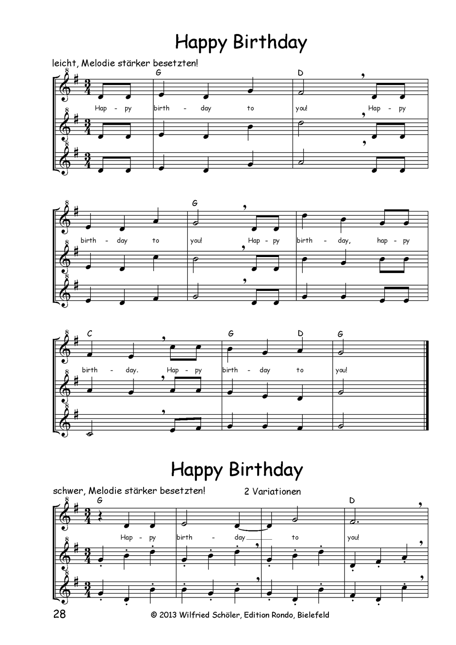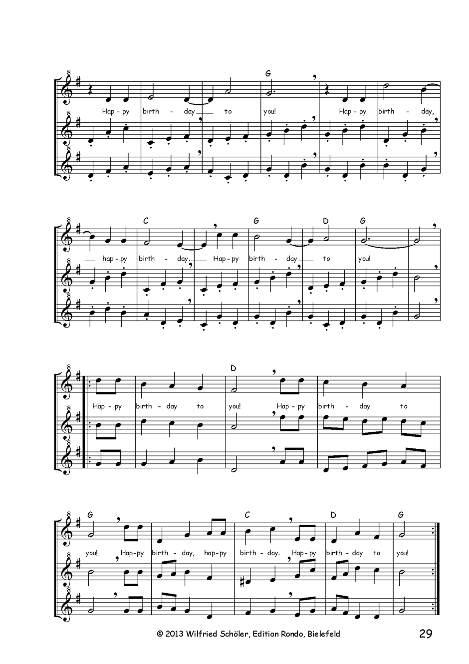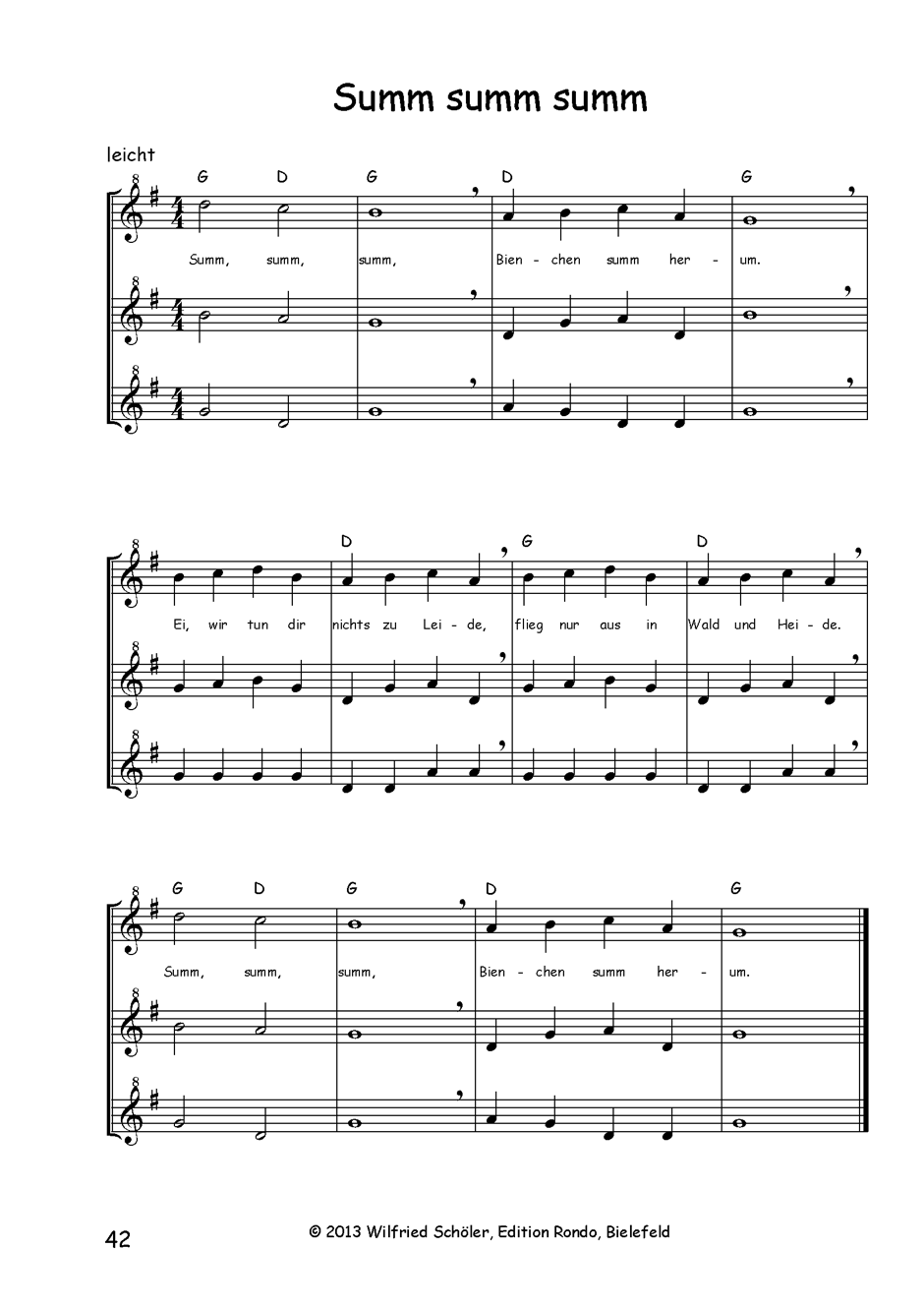 Alle Liedersätze sind jeweils für 3 Sopranflöten (Querflöten). Sie sind so eingerichtet, dass immer schon die erste und zweite Stimme einen wohlklingenden Satz ergeben. Die dritte Stimme ist eine klangliche Erweiterung, kann aber weggelassen werden, ohne dass der Satz unvollständig klingt.