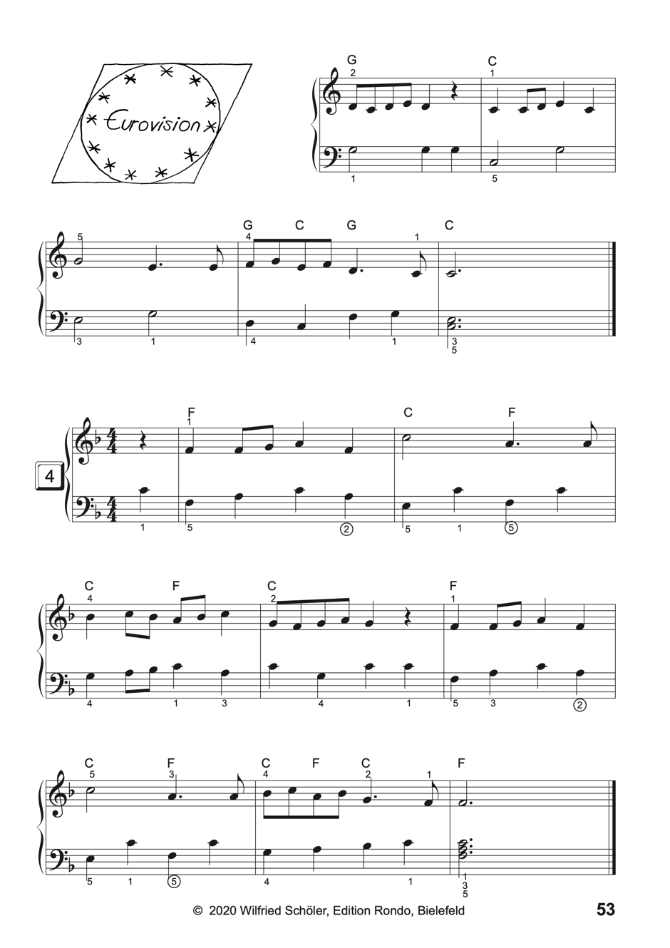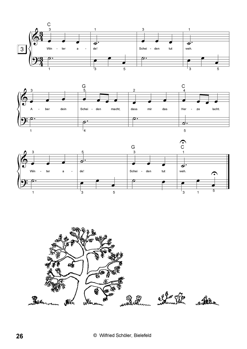 Es gibt einen Anhang, der aus sieben Stücken zum Auswendiglernen besteht, die ich bis auf das erste und letzte selbst geschrieben habe. Ihnen liegt ein sich wiederholendes Fingersatz-Schema zugrunde, und die Erfahrung zeigt, dass Kinder gerade diese Stücke mit Begeisterung spielen. Sie klingen anspruchsvoll, sind aber technisch einfach.
